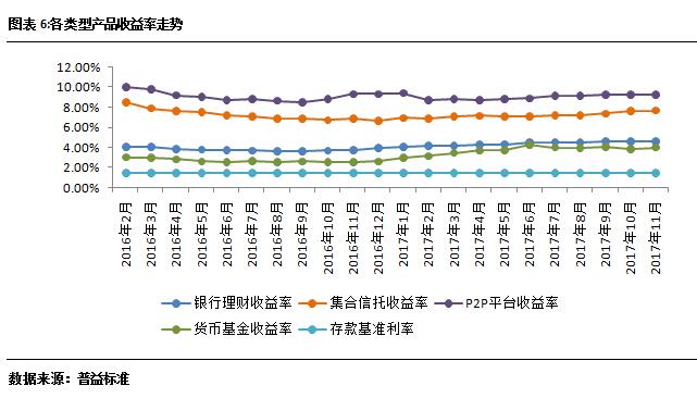 2017年11月,P2P平台产品收益率微幅回落,环比下滑1BP,至9.27%。从收益变化来看,P2P产品的收益率自2017年4月起便持续提升,而11月的微幅下滑主要是受当月部分问题平台“高回报泡沫”破裂的影响,这也侧面反应出P2P行业潜在风险仍然偏大。从近期《关于规范整顿“现金贷”业务的通知》和《关于立即暂停批设网络小额贷款公司的通知》的连续下发来看,监管层仍然高度关注互联网金融的行业风险。集合信托产品收益在近期持续走强,11月的平均收益达7.67%,环比上涨6个BP,收益的持续上涨凸显年末资金面趋紧的情况下,企业的融资成本居高不下,潜在风险仍存。未来,随着资管新规的推进,信托产品净值的生成或需符合公允价值原则,高收益预期收益型产品的发展不容乐观,信托规模增速也可能因此放缓。银行理财产品收益在10月小幅回落后,于11月重新上涨,在季节性因素对其收益的支持效应下,年末银行里慈爱收益大概率保持持续上涨态势。对于市场流动性变化较为敏感的货币基金产品收益率在11月大幅反弹,回升至4.01%,能够对投资者的闲散资资金形成较好的保值效应,但预计2018年初该类产品收益有下跌风险。