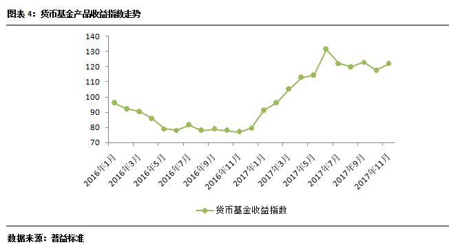 同为低风险理财产品,相比于银行理财收益指数在2017年下半年较为平滑的走势而言,货币基金收益指数的波动较为剧烈,但总体呈现下行走势。不过在2017年11月,受流动性收紧的影响货币基金表现出了明显的上涨态势。考虑到12月市场流动性大概率保持收紧状态,预计货币基金收益指数仍将持续上涨。不过,年中央行提前操作缓解6月流动性压力的情况仍值得注意,不排除12月央行增强流动性投放力度,缓解年末效应对市场的冲击。