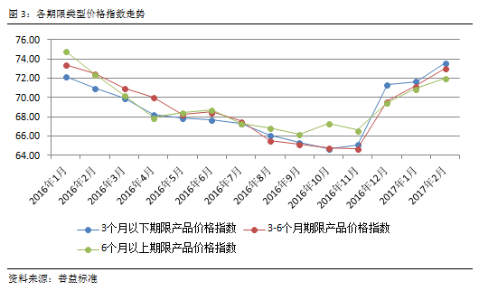 2017年2月,3类期限产品价格指数平稳上行,3个月以下期限产品价格指数涨势最强,已达73.55点,紧随其后的是3-6个月期限产品的价格指数,也达到了73.05点,而期限最长的6个月以上产品价格指数则最低,仅为72.03点。出现明显收益倒挂的主要原因是,2017年初资金紧张局面较为严重,中短期限产品需提升收益抢夺市场上的流动性资金,但预计2017年年中,流动性压力逐步释放后,资金荒的情况将得到明显缓解,长期来看其收益回落的可能性也较大,因此长期限产品的价格指数涨幅相对偏弱,不及短期产品。