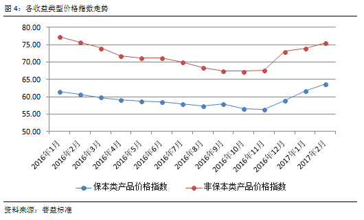 截止2017年2月保本类产品上涨幅度稳定,缓步攀升至63.65点,大幅超越2016年1月的61.56点。非保本类产品在12月大幅上涨7.98%,但进入2017年后,涨幅有明显放缓的表现,其2月价格指数升至75.55点,虽然仅回升至2016年3月的水平,但仍然显著高于保本类产品。整体来看,非保本理财产品的收益显然更有吸引力。
