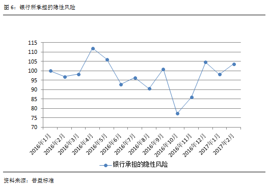 2016年底债市暴跌后,银行承担的隐性风险迅速提升至104.55点。作为银行理财依仗的主要资产,债券暴跌导致兑付风险升高,银行为保证理财产品能按约兑付,其兜底的成本大幅上涨,银行承担的隐性风险随之上升。在此之后,银行迅速调整了投资方向,加重了货币市场工具和非标债权的投资比例以取代对债券市场的过分倚重,促使银行承担的隐性风险也迅速下滑。进入2月份由于银行兑付压力增大,其承担的隐性风险又略有回升。截止2017年2月,该风险的指数达到103.60点。