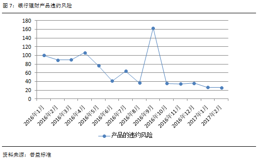 2017年2月产品违约风险的下滑幅度有所收窄,这是由于该类风险已处于较低水平,向下空间不足,违约概率极小。未来央行牵头实现资管业监管统一后,银行理财的刚性兑付或将打破,产品的违约风险有较大上升可能。