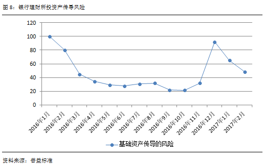 基础资产传导的风险是指由银行理财所投资的基础资产传递的风险。在2016年基础资产传导风险整体呈现逐步下滑趋势,但在2016年12月债券市场风险事件爆发后,此类风险迅速攀升,在12月当月便已上升至92.05点。虽然在2017年初,该风险迅速下滑,于2月已至48.63点,但相较2016年中期水平而言,该风险仍然偏高。