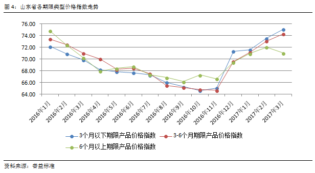从期限上看,各类期限产品价格指数有较大差异,自2016年底开始的收益倒挂现象愈演愈烈。其中3个月以下产品的价格指数自2016年12月开始便表现强势,本月环比上涨2.09%并突破75点,大幅超过2016年1月水平;3-6个月产品上涨幅度同样强劲,环比上涨1.70%达74.29。中短期限产品在3月的大幅上涨,说明山东省资金慌的情况较为严重。相比较中短期限产品收益的节节攀升,6个月以上期限的产品价格指数则继续下滑,环比下滑1.36%至71.05。长期限产品价格指数的持续下滑,反映出山东省商业银行不看好未来收益的持续向上,随着流动性缓释,预计4月流动性稍显宽松后,短期理财收益将有所回落。