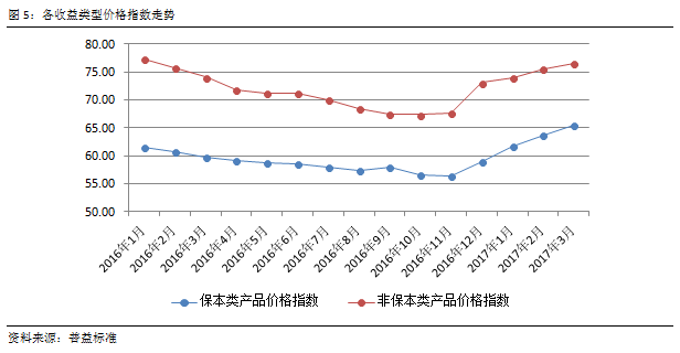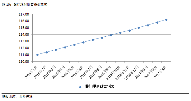 由于银行理财通常以预期收益的形式发行,因此收益与时间呈现正相关关系。由图可见,财富指数随着时间的增长持续上行,仅有单月增幅差异的变化。2017年3月,财富指数达116.22点,较2月增长0.41点,增幅为0.35%。各期限类型的产品中,6个月以上期限类型的产品财富指数最高,达116.57点;而3-6个月期限类型产品也有116.47点;3个月以下期限类型产品财富指数仅为115.98点。从近期价格指数的变化来看,短期内收益倒挂现象仍然存在,但长期的财富积累仍然展现了产品流动性越差(期限越长),收益越高的逻辑。