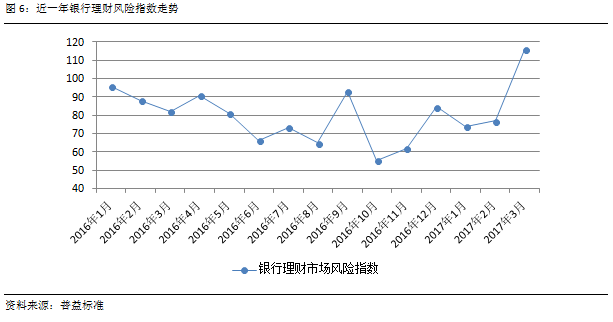 2017年3月,山东省银行理财市场风险指数出现了飙升,从2月的76.90点上涨至115.92点,较2016年同期大幅上涨。山东省银行理财市场风险指数的大幅上涨与近期市场流动性收紧后,商业银行被迫提升产品收益吸收资金有较大关系。在基础资产收益没有明显改善的情况下,大幅提升了产品收益即增加了银行所承担的产品违约的风险,因此银行理财市场风险指数迅速上升。不过对于投资者而言,在刚性兑付的未打破前,该风险不会转嫁给投资者,因此对于投资者而言投资银行理财产品仍然是资产保值的较优选择。