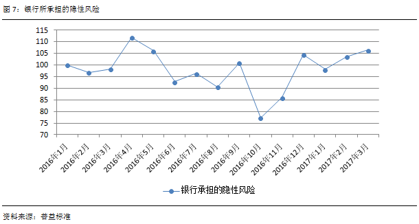山东省内银行承担的隐性风险在2017年1月有明显回落,但在2-3月却持续向上,至3月时,隐性风险已达106.48点,环比上升2.78%,远超2016年12月的水平。