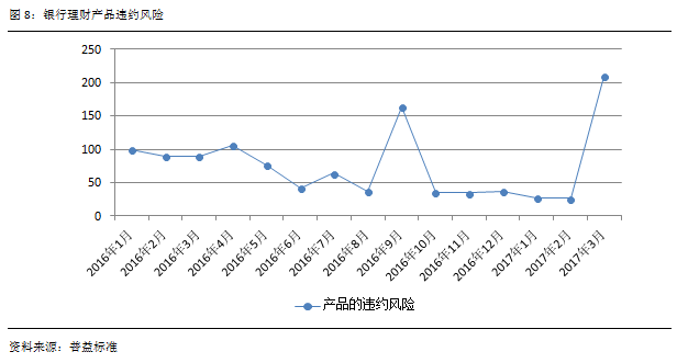 产品违约风险指的是银行理财产品到期后无法按照预期收益率兑付的风险。近期,银行理财产品的违约风险总体呈现缓步下滑的趋势,但在2017年3月,受流动资金回笼、美联储加息、监管考核临近等多方面因素的影响,市场流动性大幅收紧,致使资金的供需极不平衡,其中银行间7天回购利率大涨至3.85%,为两年内最高。基于此情况,银行理财迅速提升收益抢夺市场流动性,但在基础资产收益没有上涨的情况下,大幅提升收益率必然致使违约风险高升,这也导致山东省银行理财产品违约风险指数疯狂上涨,至209.44点。随着市场流动性压力缓解,违约风险将在4月出现明显回落。