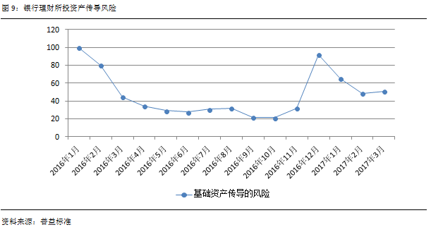 2017年1季度初,基础资产传导的风险迅速下滑,在2月滑落至低点48.63,但随着资金面的收紧,基础资产传导的风险在同年3月上升4.32%至50.73。从历史表现来看,2017年3月的风险指数仍明显高于2016年同期水平,预计随着债市去杠杆的深化,基础资产的风险缓释,未来基础资产传导的风险将有所下滑。