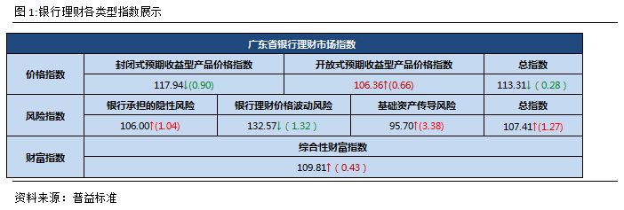 广东省银行理财风险指数是由目标银行承担的隐形风险、产品的价格波动风险以及投资于基础资产传递风险三类风险加权所得,主要反映了银行理财市场的整体风险状况。该指数越大说明对应市场的风险也越高,反之则风险越低。