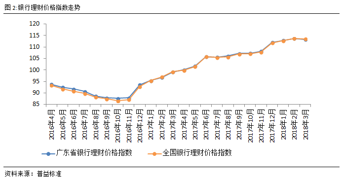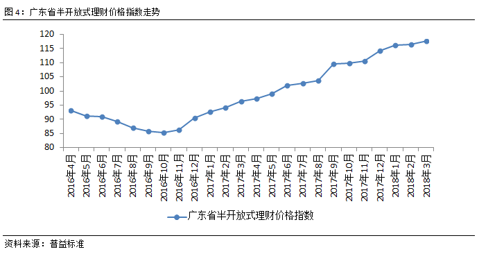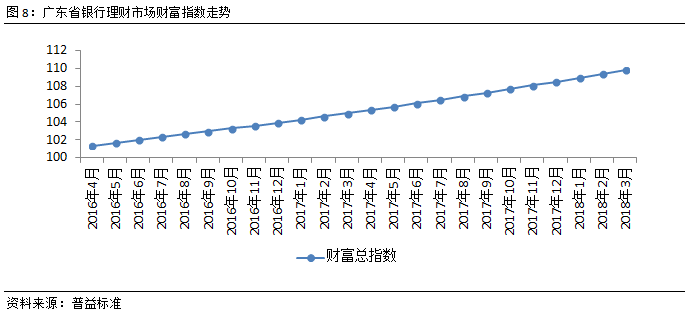 广东省财富总指数持续上涨,理财财富稳定累积。由于银行理财通常以预期收益的形式发行,因此收益与时间呈现正相关关系。由图可见,广东省银行理财市场财富指数随时间推移持续上行,仅有单月增幅差异的变化,2018年3月,广东省财富指数环比上涨仍然是0.43点,当前指数为109.81点,银行理财财富稳定累积。