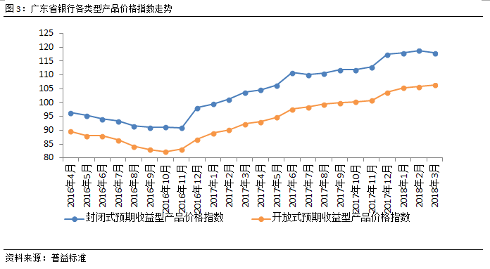 3月广东省理财价格指数有所回落,环比下降0.28点至113.31点。各类产品价格指数呈现分化走势,其中,封闭式预期收益型产品价格指数在上月上升幅度高于开放式预期收益型产品价格指数后,本月却出现了下滑,环比下降0.90点至117.94点;开放式预期收益型产品价格指数保持上涨走势,环比上涨0.66点至106.36点。3月银行体系流动性总体较为平衡,多数时间里,短期流动性保持着充裕状态,市场流动性预期较为乐观。封闭式预期收益型产品作为银行调节流动性的重要工具,对资金面情况更敏感,开放式产品受资金面的影响相对偏低,整体收益变化具有一定的惯性,在季末考核的影响下,开放式有向上抬升的动力。
