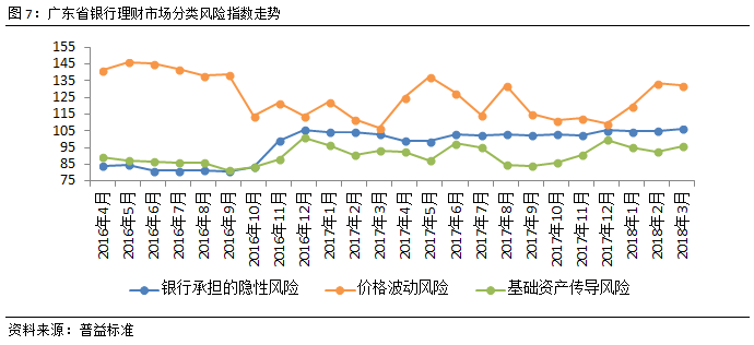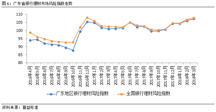 广东省银行理财总风险持续上升。与全国银行理财风险指数趋势相同,广东省银行理财总风险进一步上升,但是广东省银行理财风险低于全国平均水平。资管新规即将落地,对市场的流动性仍将存在冲击,预期或造成短期的市场调整震荡,使得风险加剧。同时,中美贸易摩擦,也使得市场存在对流动性的担忧。