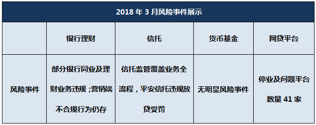 2018年3月,违规开展/参与同业理财业务以及营销端的不合规行为仍然是针对银行理财处罚的重灾区。其中安徽利辛农商行存在同业及理财业务风险管理流程、人员、资金未严格分离的行为,被当地银监局处罚20万元人民币;另一方面并套取理财资金开展票据业务。另外,中国农业银行灵宝市支行在营销端出现了理财业务未按照规定实施“双录”等违规操作,被处罚50万元。2018年大型银行分支机构营销不合规行为持续爆发,相对而言区域银行由于网点较少且分布相对集中,整体管理效果更好,投资者在选择理财产品时也可以更多地考虑当地具有实力的区域银行。货币基金在3月继续维持无明显风险事件的状态,但监管对于货币基金风险的关注从未放松过。近期监管层对于销售及T+0垫资问题的规范,在清除乱象的同时也对货币基金的便利性造成了较大的冲击,不排除未来投资者将留存部分资金于高流动性存款业务中以应对不时之需,进而造成货币基金规模的微降。相对于罚单频出的2月,3月信托行业表现有所好转,仅平安信托因违规向土地收购储备中心放贷,严重违反审慎经营规则,被罚款30万元人民币。3月P2P停业及问题平台数量为41家,较2月减少了14家。对比2月,虽然从停业及问题平台数量来看,3月的情况有所好转,但从问题平台的性质而言,3月所表现出的平台风险更高。受合规性调整影响,2月平台停业调整的情况较多,这中间部分平台是主动寻求停业转型,以适应未来的发展趋势。但3月跑路及提现困难的银行数量大幅增长,共占总数量的31.70%,表明该类业务仍具有较高风险,投资者在追求高收益的同时,也应警惕风险,尽量选择规模较大,声誉良好的平台。