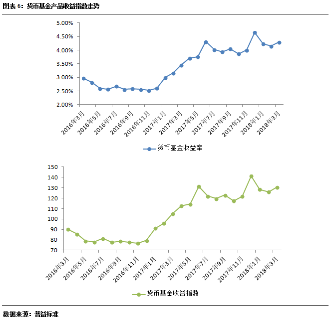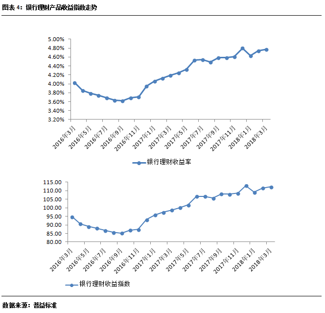2018年3月,P2P平台产品收益率明显回落,环比下滑23BP,至9.27%。从收益变化来看,行业的合规性调整促使不符合监管要求的的高收益产品迅速退出,致使该类产品的平均收益迅速下滑。考虑到网贷平台备案制临近,各家平台清理问题产品的步伐或将进一步提速,因此4月该来产品仍有下降空间。在连续9个月收益上涨后,集合信托理财产品收益于3月出现微幅回落,3月的平均收益达8.08%,环比下滑2BP。自55号文后,信托通道业务的压缩速度持续提升。至2018年3月,包含了通道业务的事物管理类信托发行量环比下滑超过7成。不过相比于P2P行业,信托通道业务的压缩已持续了较长时间,信托行业的整体波动不太可能发生,因此预计信托产品收益在近期仍以小幅震荡为主。银行理财产品收益在3月继续上涨,虽然春节过后整体资金面区域稳定,但在季末考核的影响下,理财产品收益并未出现明显下滑的变化。不过在季末时点过后,银行理财收益或将在4月上旬迎来一定的回调,但随着4月中旬资金面压力的增大,整体收益仍将以稳健为主。2018年3月,货币基金收益在利率没有明显回落的支撑下,环比上涨15BP至4.30%。近期货币基金收益与银行理财收益相对接近,但考虑其便利性、流动性、投资门槛等因素,有一定流动性需求的投资这可选择此类产品。不过需要注意的是,监管对于货币基金支付的调整,或使投资者的便利性下滑,投资者可能需要将一部分资金留存于存款类产品中以保障不时之需。