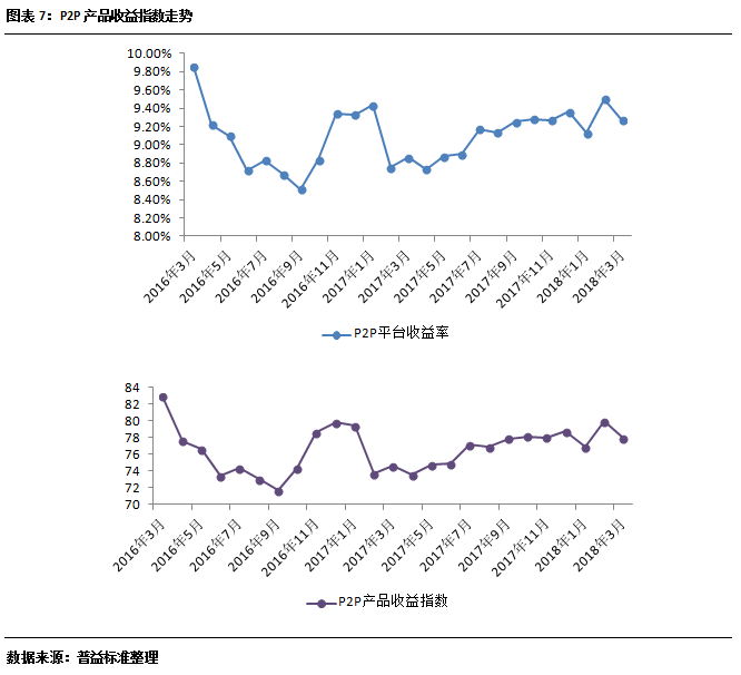 2018年3月,P2P产品收益环比下滑23BP至9.27%,收益指数相应下滑1.95点至78.03点。从当前P2P产品的变化趋势来看,整体借款期限继续拉长,降低期限错配的可能性,响应监管要求。与此同时,大量P2P平台调整业务模式,将部分高收益却不符合监管要求的业务或产品砍去,保证平台的合规性。例如,P2P平台你我贷便暂停了其部分不合规产品的运行,而红岭创投也暂停了三项业务以符合监管政策的规定。在行业合规调整的过程中,随着高收益不合规产品的清出,P2P的整体收益必然面临着新的一轮下滑,这种情况在备案制前后或将体现的较为明显。因此预计4月,P2P产品收益仍有向下可能性。
