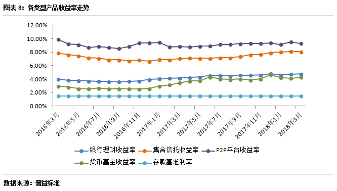 2018年3月,随着资金需求高峰结束,市场流动性相对宽松,财富管理市场整体收益表现趋于稳定,但各类产品走势分化仍然显著。其中银行理财保持了较为平稳的走势,环比上涨3BP至4.77%;货币基金大幅反弹,环比上涨15BP至4.30%;信托理财产品结束了连续9个月的上涨表现,环比下滑2BP至8.08%;P2P产品收益趋于回落,环比下滑23BP至9.27%。