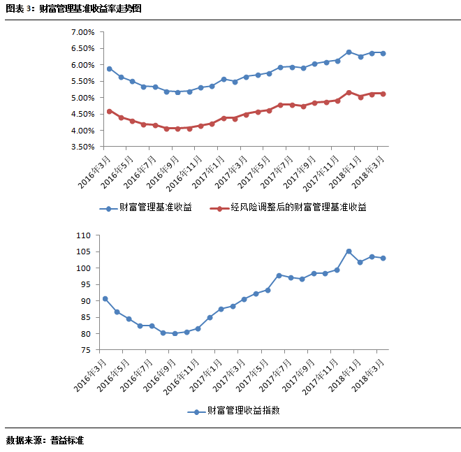 在流动性环境区域宽松以及季末时点效应的相互影响下,2018年财富管理基准收益及经风险调整后的财富管理基准收益走势相对平缓。不过对比两类收益走势来看,财富管理基准收益受信托及P2P产品的收益下滑影响,呈现出一定的向下趋势;而经过风险调整后,受低风险产品影响更大的险调整后的财富管理基准收益则表现出了一定的上行趋势。两类收益不同的走势凸显出3月各类型产品收益受不同因素影响差异偏大。不过随着季末的结束,4月两类收益的变化趋势将重新呈现趋同表现。考虑到4月市场流动性有趋紧迹象,预计两类财富管理基准收益上行概率增大。