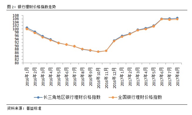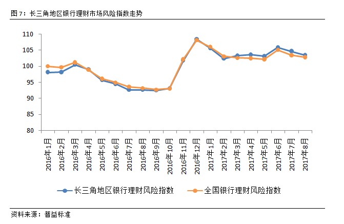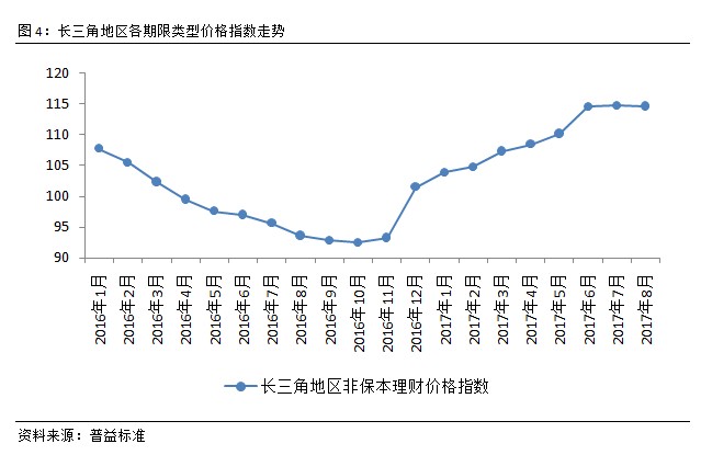 将长三角地区银行理财市场价格指数与全国银行理财市场价格指数对比可以发现,2017年8月,两类指数差异已经较为明显。两类指数走势较为一致,说明长三角地区银行理财市场的发展程度与全国同步,而前者水平略高于全国平均水平,则表明长三角地区的资金需求相对更为强烈。