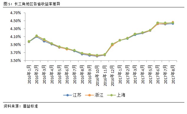 长三角各省银行理财收益微幅上涨。8月,长三角地区各省银行理财收益继续维持了稳中有升的局面。一方面,年中考核时银行理财收益已经处于较高的水平,之后向上大幅突破的动力明显不足,另一方面,新的货币政策出台,监管进一步收严,市场资金面仍是趋紧的,预计未来一段时间这种趋紧的局面不会改变,因而收益水平始终居高不下。受十九大召开的影响,各地区将维持稳定的状态,预计各省银行理财收益不会出现大幅波动的情况,稳中有升将会是未来的大概率事件。