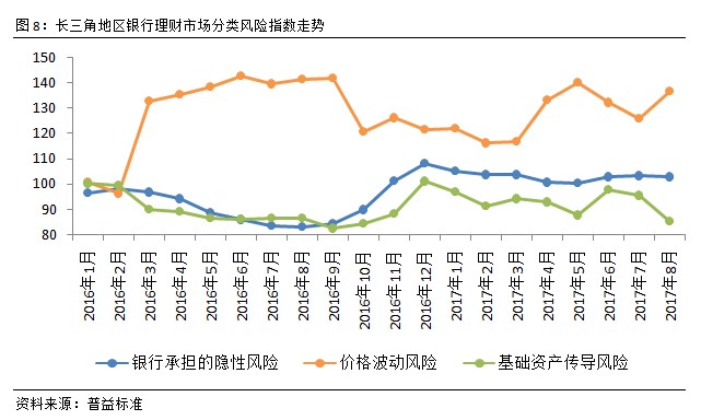 价格波动风险与基础资产传导风险走势分化,整体风险下滑。从风险指数看,8月长三角地区银行理财市场风险指数延续了7月的下降趋势,环比下降1.18点至103.44点。具体来看,由银行承担的隐性风险环比下降0.45点至102.74点,价格波动风险本月出现大幅上扬,环比上涨10.72点至136.54点,基础资产传导风险则延续了7月的下降趋势,且下降幅度进一步扩大,环比下降10.08点至85.25点。基础资产传导风险大幅下跌是带动整体风险下滑的主要原因。