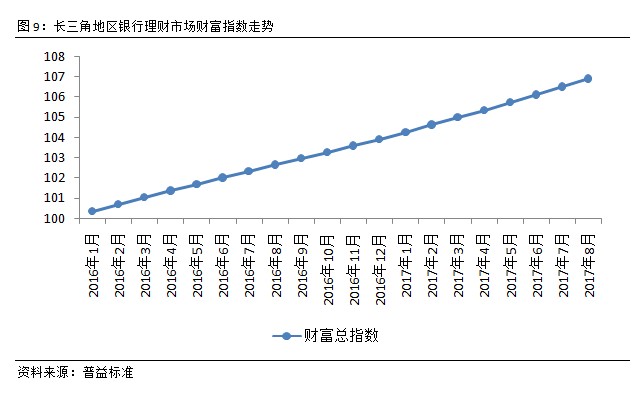 长三角地区银行理财财富指数平稳上升。由于银行理财通常以预期收益的形式发行,因此收益与时间呈现正相关关系。由图可见,长三角地区银行理财市场财富指数随时间推移持续上行,仅有单月增幅差异的变化。2017年8月,长三角地区财富指数维持了与7月相同的涨幅,环比上涨0.39点至106.89点。财富指数平稳上升,长三角地区财富稳定累积。