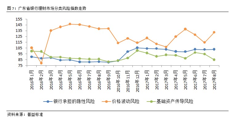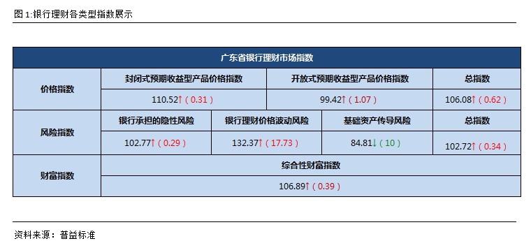 广东省银行理财风险指数是由目标银行承担的隐形风险、产品的价格波动风险以及投资于基础资产传递风险三类风险加权所得,主要反映了银行理财市场的整体风险状况。该指数越大说明对应市场的风险也越高,反之则风险越低。