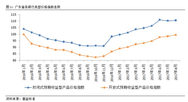 封闭式及开放式产品价格指数双双普涨。8月,广东省开放式产品价格指数继续维持向上的态势,封闭式产品价格指数在7月出现回落过后重回上升轨道,封闭式与开放式产品价格指数双双普涨。这主要是受短期市场情绪的影响。6月以来监管松绑、7月央行大规模流动性净投放表现出“双松”局面,导致市场形成接下来政策收紧的心理预期,致使8月封闭式与开放式预期收益型产品价格指数均出现上涨。另一方面,开放式产品正逐步成为未来银行的主流发展方向,致使该类价格指数持续上涨。预计9月,开放式产品的价格指数有望突破100点。