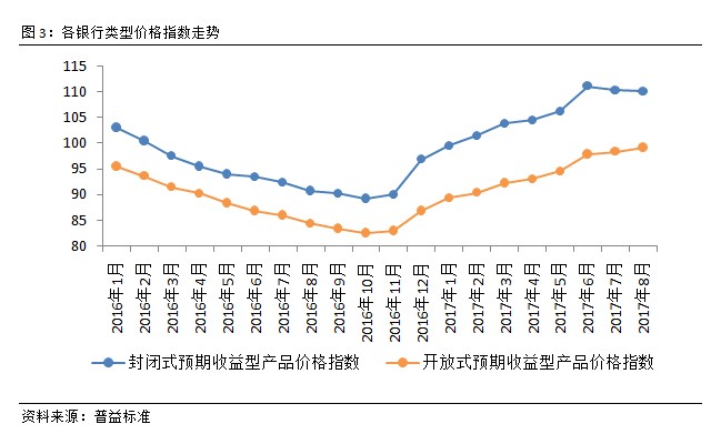 开放式预期收益型产品价格指数持续上行。8月,全国范围内封闭式和开放式预期收益型产品价格指数的差异化表现更为明显。其中,封闭式产品价格指数环比下滑0.19点至110.08点;开放式产品价格指数环比上涨0.84点至99.16点。从2017年6月开始两类指数的变化出现了明显的分化,封闭式预期收益型产品价格指数呈现了较为平稳的下行表现;而开放式预期收益型产品则延续了上半年的走势,持续上行。封闭式理财产品价格指数的下滑与上半年末的冲高有较大关系,随着近期收益的逐步调整,预计未来价格指数走势会与开放式产品趋同。不过值得注意的是,拥有更高流动性的开放式产品价格指数持续上涨喻示着此类产品的价格竞争力持续提升,未来或吸引更多的投资者选择此类产品。
