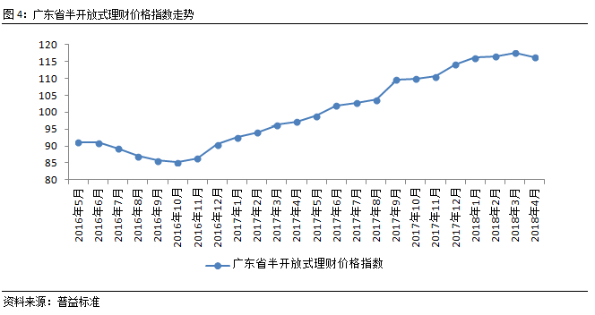 从理财价格指数来看,广东省理财价格指数持续回落,且跌幅扩大,环比下跌1.31点至112点。其中。封闭式预期收益型产品价格指数连续下跌,环比下跌1.41点至116.53点;开放式预期收益型产品价格指数结束连续17个月的上涨,本月出现回落,环比下跌1.15点至105.21点,开放式预期收益型产品与封闭式预期收益型产品走势趋于一致。4月,市场流动性紧张程度有所缓解,促使金融机构融资成本有所下降。