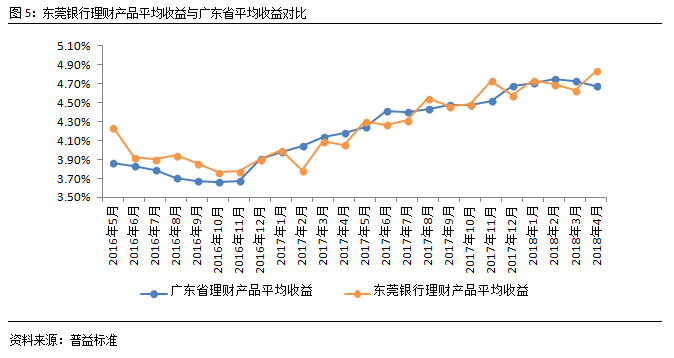 从收益表现来看,在跨季过后,央行定向降准,市场流动性紧张程度有所缓解的情况下,市场对资金需求的程度有所减弱,广东省理财产品收益自然呈现下滑趋势,环比下降5BP至4.68%,但是东莞银行理财产品收益却逆势上涨20BP至4.84%,高于广东省理财产品的平均收益水平。