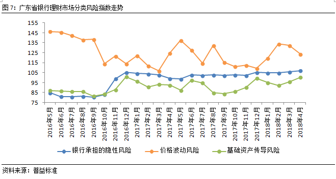 从风险指数来看,4月,广东省银行理财市场风险小幅上升,基础资产传导风险继续增大,银行理财价格波动风险显著下降,总体风险可控,总风险指数环比上涨0.53点至107.94点。其中,由银行承担的隐性风险环比增加1.12点至107.12点;价格波动风险环比下降8.76点至123.81点;基础资产传导风险环比上涨4.66点至100.36点。 4月市场流动性相对宽松,促使银行理财价格波动风险有所下降;而资管新规落地,包括银行业在内的整个金融体系受到较大的冲击,促使银行承担的隐性风险和基础资产传导风险有所上升。
