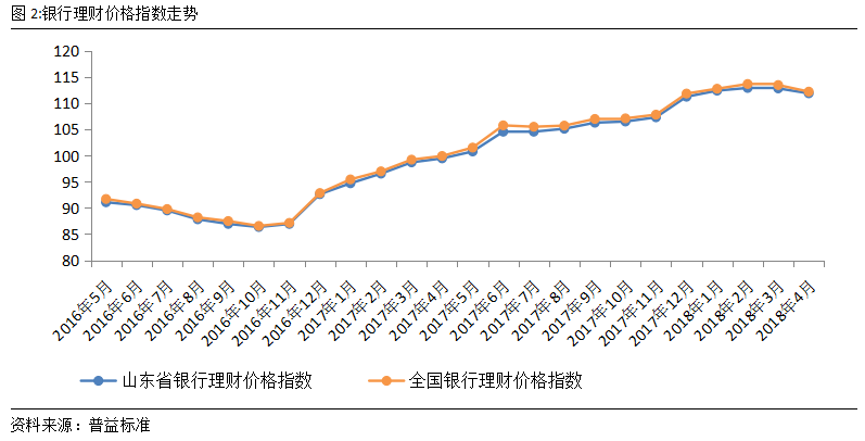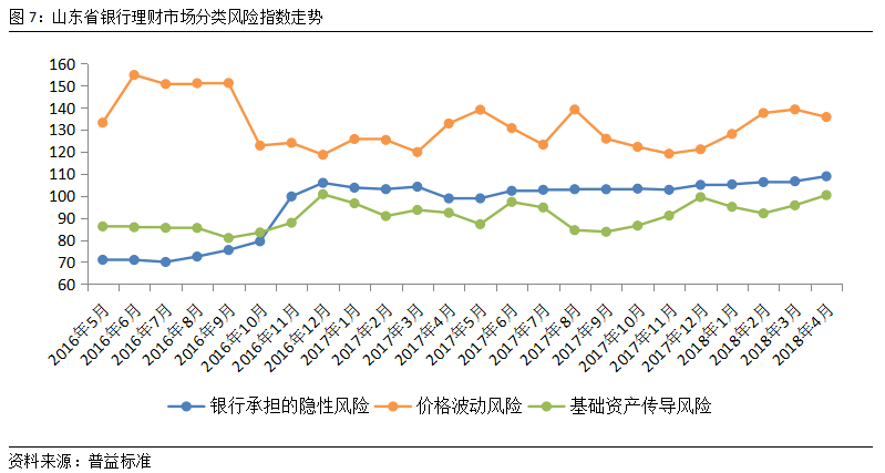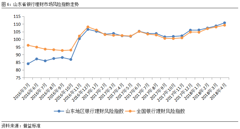 山东省银行理财风险涨势与全国一致。2018年4月,山东省银行理财风险指数与全国银行理财风险均有所上扬。从风险水平来看,受地区特质因素影响,山东省银行理财市场风险涨幅大于全国平均,水平略高于后者。从风险指数走势来看,近一年以来,山东地区与全国走势基本一致,无较大差异,表明山东地区发展程度接近全国平均水平。
