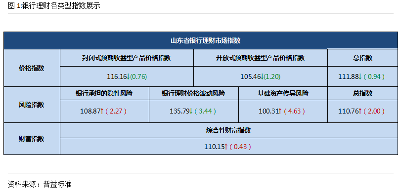 山东省银行理财风险指数是由目标银行承担的隐形风险、产品的价格波动风险以及投资于基础资产传递风险三类风险加权所得,主要反映了银行理财市场的整体风险状况。该指数越大说明对应市场的风险也越高,反之则风险越低。