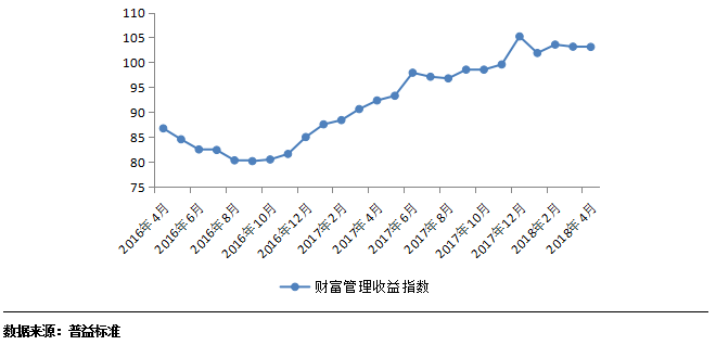 在央行降准的措施的保障下,4月市场流动性保证了较高程度的稳定性,进而促使各类型机构定价压力减弱,整体财富管理收益指数出现微幅下行变化。经过长达一年的持续上涨,财富管理收益指数在2018年3月及4月迎来了可能出现的下滑拐点。事实上如无三月季末因素对于各类理财产品收益的支撑作用,财富管理指数在3月便会迎来较为明显的下行表现。考虑到资管新规对于具有刚性兑付性质资管产品的新增限制,预计此类型产品在流动性环境及监管环境不发生明显变动的情况下,将呈现稳步下滑变化,尤其是银行理财产品,已便于后期引导客户转投存款性质的投资品。