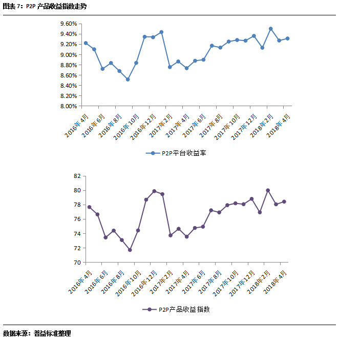 2018年4月,P2P产品收益环比上涨4BP至9.31%,收益指数相应下滑0.38点至78.41点。随着备案制的延期,各家平台有了更充足的调整空间,但也在一定程度上加重了行业的焦虑情绪。较多P2P平台进一步的对现有存量业务进行梳理,逐步暂停可能不合规范的业务;与此同时,部分对于备案信心不足的平台也逐步选择主动退出,加快了市场的规范力度。在行业大幅调整的环境下,近期P2P产品的收益波动也偏大,但考虑到P2P产品所必要维持的竞争力,预期整体收益仍将保持在9%附近,下行空间不大。当然在较大的监管压力,逐步增高的合规成本下,P2P产品收益大幅上行的可能性也不大。
