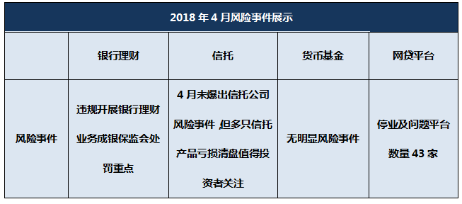 2018年4月,监管层针对理财业务的违规行为的检察没有松懈,多家全国性银行面临高额罚单。其中建行温州分行因违规销售理财产品等行为被当地分局处罚100万元罚款;招商银行销售同业非保本理财产品时违规承诺保本等行为收到巨额罚单;兴业银行因个人理财资金违规投资等行为也受到了监管层给予的高额惩处;浦发银行通过资管计划投资分行协议存款,虚增一般存款、理财资金投资非标准化债权资产比例超监管要求、投资多款同业理财产品未尽职审查,涉及金额较大等因素同样面临巨额罚款。在资管新规落地前后,监管层增大对于资管行业风险事件的清除力度有望推动银行资管业务转型的提速。货币基金在4月继续维持无明显风险事件的状态,但随着资管新规落地,货币基金的收益保障已不再延续,未来投资者教育的重要程度将持续提升。4月,信托行业表现相对平稳,并未有信托公司受到监管处罚,但需要注意的是,近期多只信托产品清盘退出,暴露出刚性兑付掩饰下信托产品所蕴含的风险。在资管新规明令禁止刚兑后,信托产品违约、亏损的风险或将继续释放。4月P2P停业及问题平台数量为43家,较3月增加了2家。借鉴外部机构统计数据可以看出,网贷平台项目逾期率持续上涨,在备案制延期后,各家平台的压力进一步增大,平台的退出形式逐步从受监管影响的“被迫退出”转向了市场适应过程中的“主动退出”,进一步凸显P2P行业较大转型压力。面对风雨飘摇的P2P平台转型期,投资者在选择产品时一定需要更为谨慎。