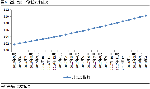全国财富指数保持平稳上涨。由于银行理财通常以预期收益的形式发行,因此收益与时间呈现正相关关系。银行理财市场财富指数随时间推移持续上行,仅有单月增幅差异的变化。2018年4月,财富指数达110.22点,涨幅平稳,银行理财财富稳定积累。
