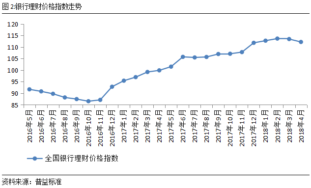 全国银行理财价格指数持续回落,不同开放类型产品价格指数走势趋同。2018年4月,全国银行理财价格指数继续下行,跌幅扩大,环比下跌1.26点至112.20点,其中封闭式预期收益型产品价格指数继续下跌,环比下跌1.30点至116.46点;开放式预期收益型产品价格指数结束连续17个月的上涨,本月出现回落,环比下跌1.19点至105.81点,开放式预期收益型产品与封闭式预期收益型产品走势趋于一致。