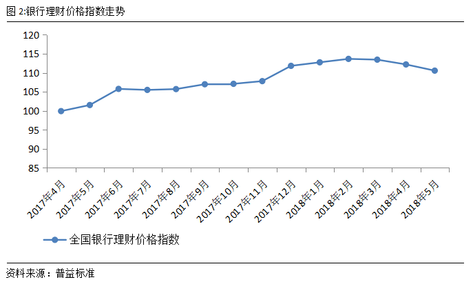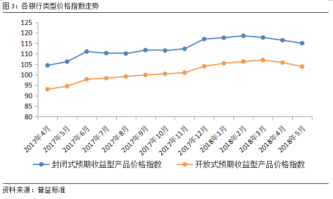 全国银行理财价格指数稳步回落,不同开放类型产品价格指数走势趋同。2018年5月,全国银行理财价格指数持续下行,环比下跌1.63点至110.57点,其中封闭式预期收益型产品价格指数继续下跌,环比下跌1.43点至115.03点;开放式预期收益型产品价格指数在结束连续17个月的上涨后,本月继续回落,环比下跌1.93点至103.88点,开放式预期收益型产品与封闭式预期收益型产品走势趋于一致。