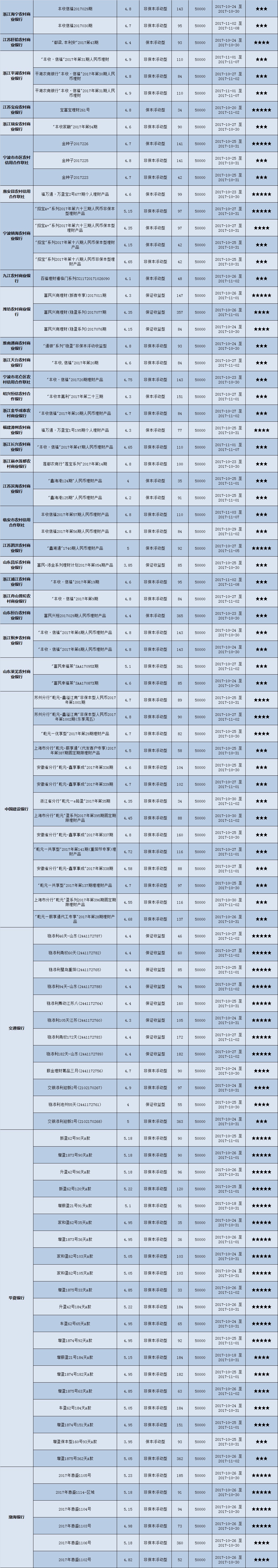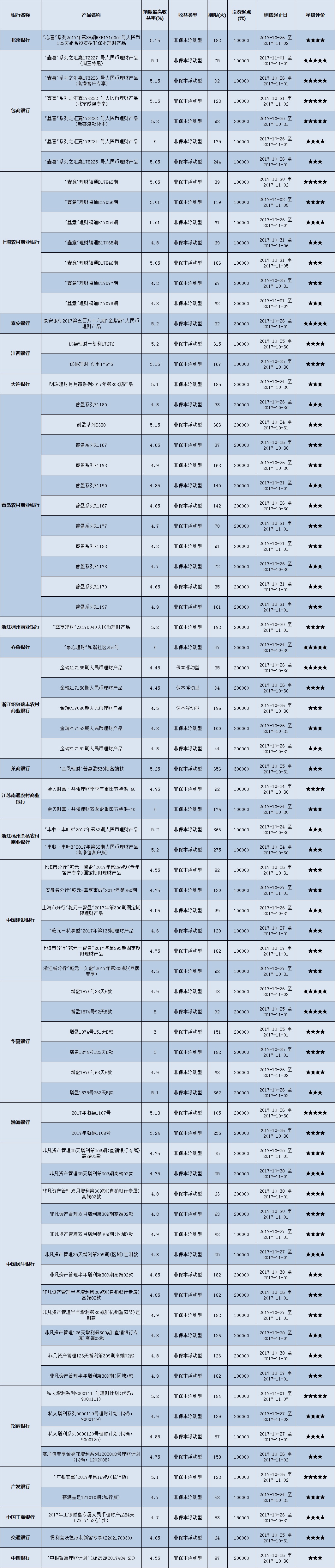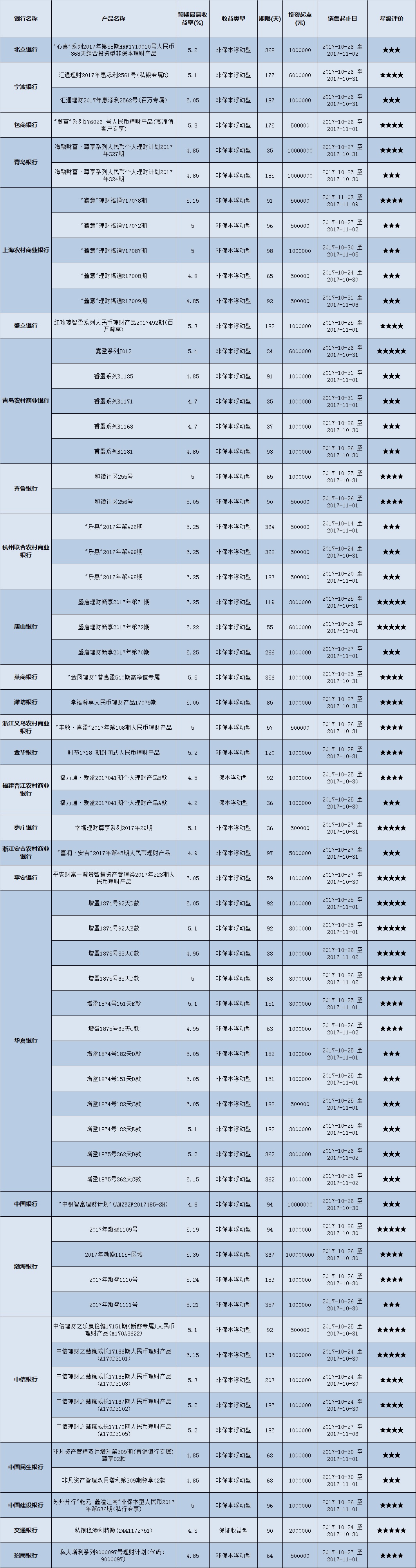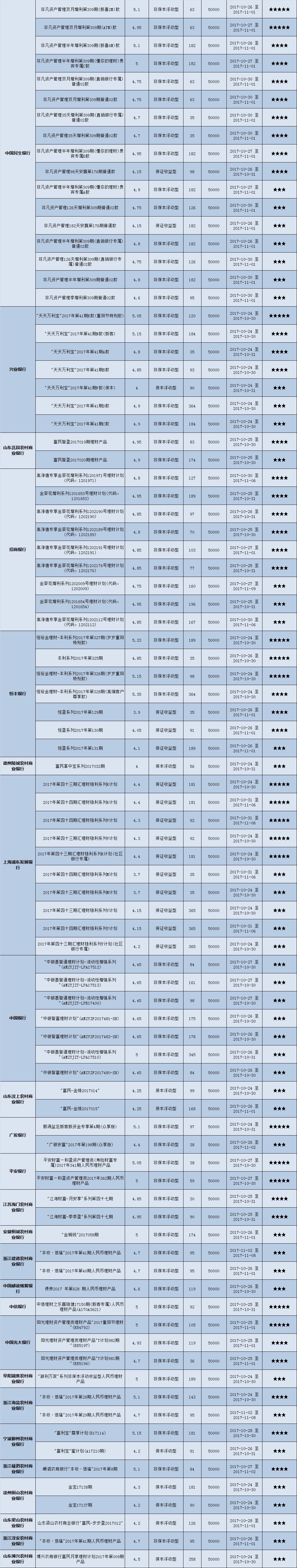 高门槛(50万元及以上)的理财产品中,华东地区有61款获得普益标准星级评定,平均预期收益率为5.03%。其中三星产品27款,平均预期收益率为4.97%;四星产品22款,平均预期收益率为5.1%;五星产品12款,平均预期收益率为5.07%。