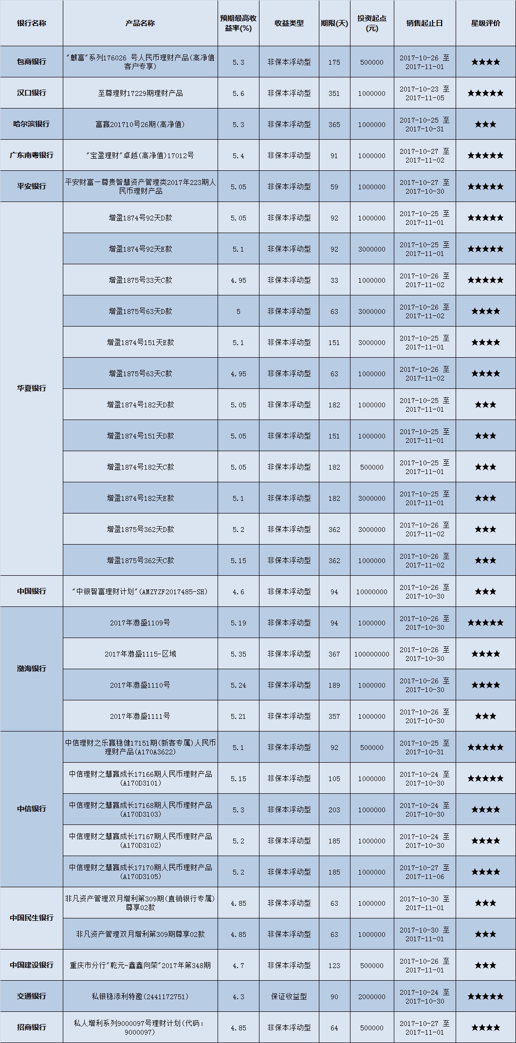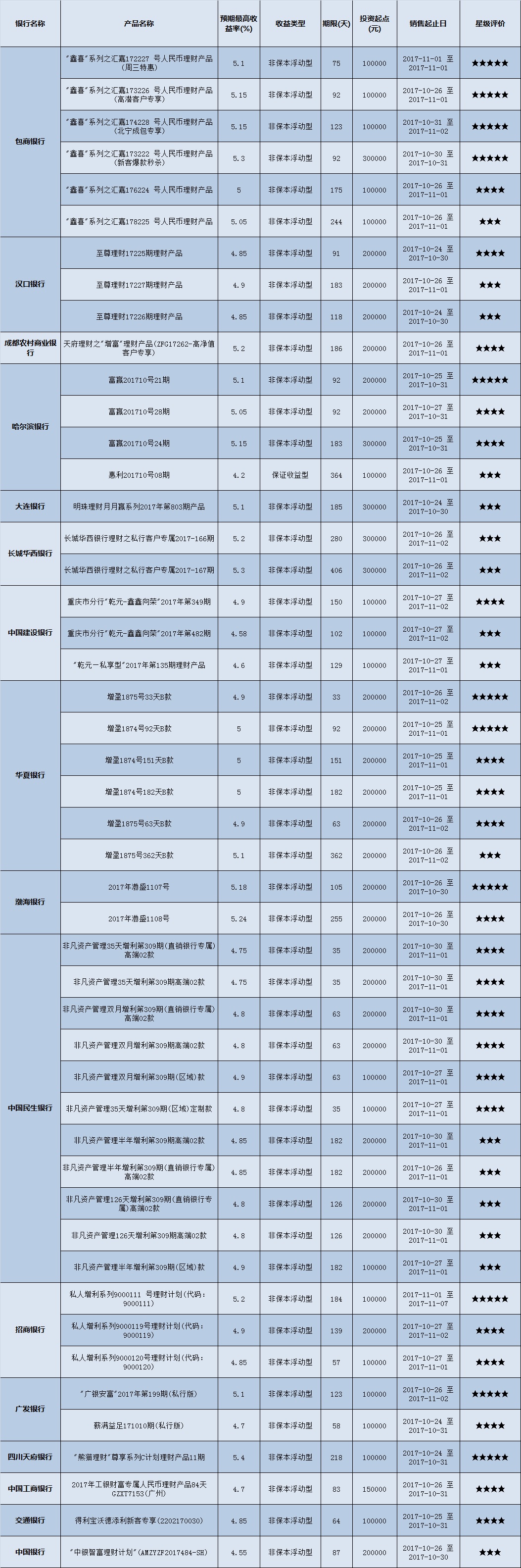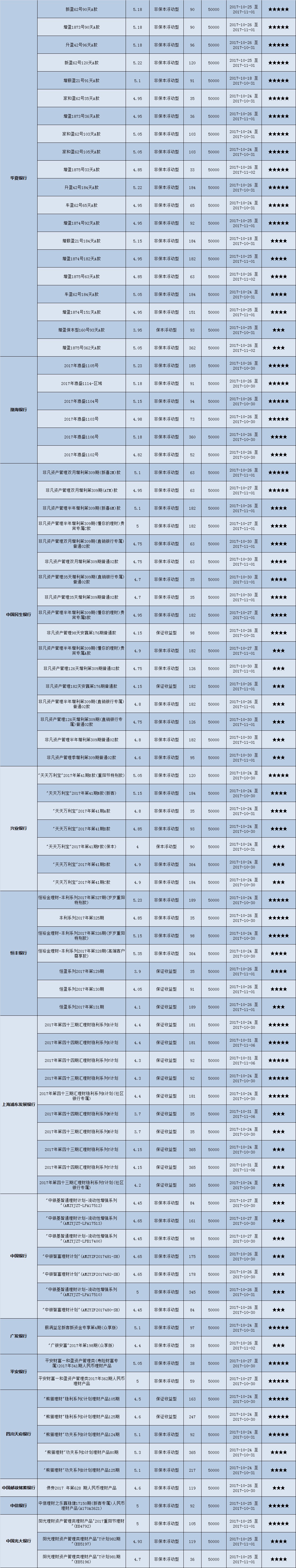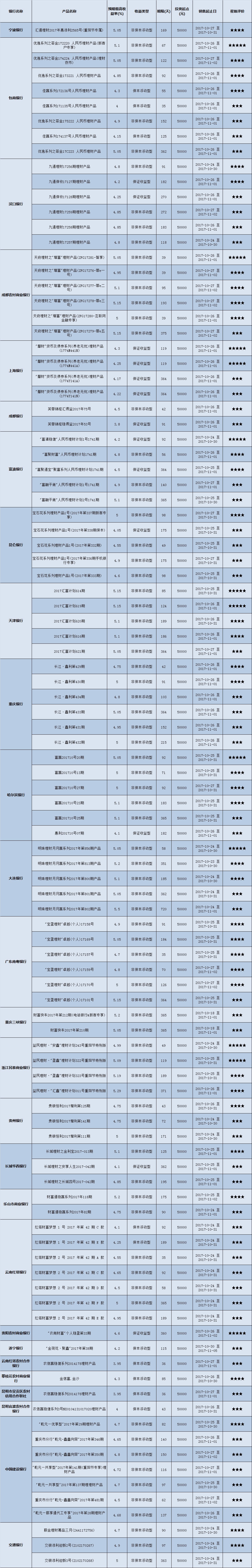 高门槛(50万元及以上)的理财产品中,西南地区有32款获得普益标准星级评定,平均预期收益率为5.08%。其中三星产品12款,平均预期收益率为5.01%;四星产品10款,平均预期收益率为5.15%;五星产品10款,平均预期收益率为5.09%。