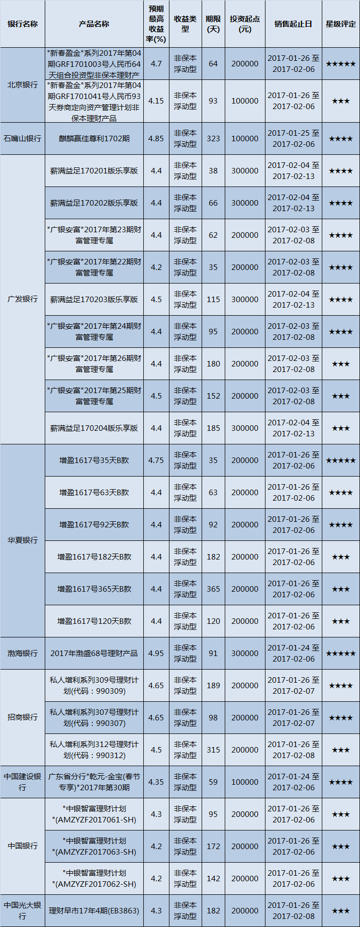 高门槛(50万元及以上)的理财产品中,西北地区有30款获得普益标准星级评定,平均预期收益率为4.52%。其中三星产品17款,平均预期收益率为4.46%;四星产品9款,预期收益率为4.52%;五星产品4款,预期收益率为4.73%。