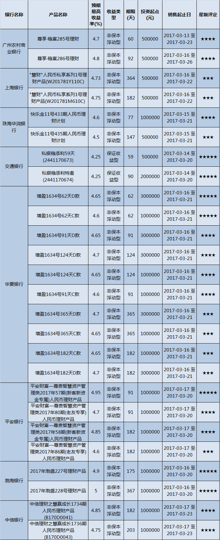 高门槛(50万元及以上)的理财产品中,华南地区有26款获得普益标准星级评定,平均预期收益率为4.68%。其中三星产品8款,平均预期收益率为4.66%;四星产品11款,平均预期收益率为4.71%;五星产品7款,平均预期收益率为4.66%。