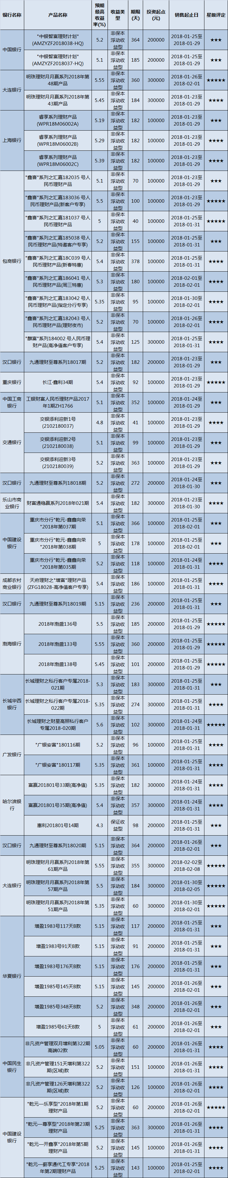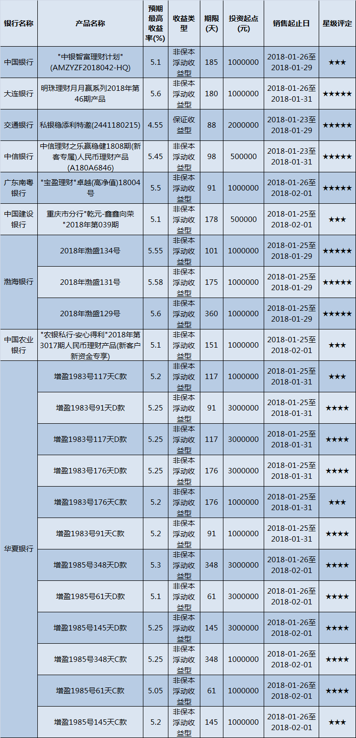 高门槛(50万元及以上)的理财产品中,西南地区有22款获得普益标准星级评定,平均预期收益率为5.26%。其中三星产品6款,平均预期收益率为5.15%;四星产品9款,平均预期收益率为5.21%;五星产品7款,平均预期收益率为5.4%。