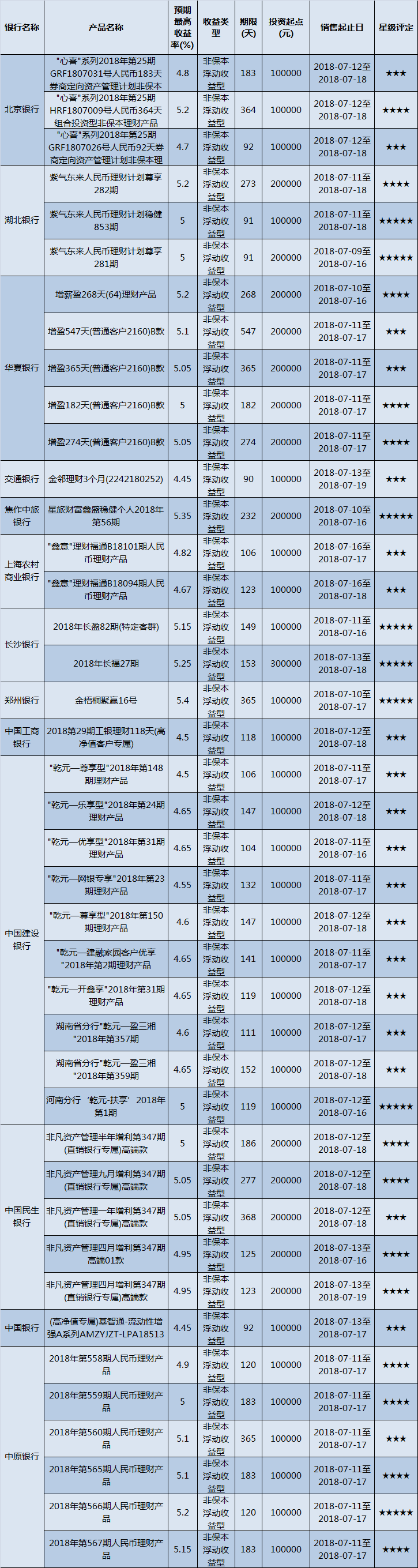 低门槛(10万元以下)理财产品中,华中地区有130款获得普益标准星级评定,平均预期收益率为4.92%。其中三星产品47款,平均预期收益率为4.62%;四星产品43款,平均预期收益率4.96%;五星产品40款,平均预期收益率为5.22%。