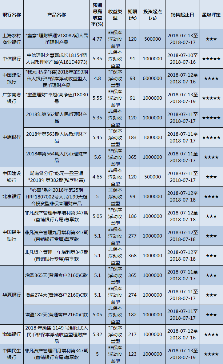 高门槛(50万元及以上)的理财产品中,华中地区有17款获得普益标准星级评定,平均预期收益率为5.14%。其中三星产品8款,平均预期收益率为4.99%;四星产品5款,平均预期收益率为5.14%;五星产品4款,平均预期收益率为5.42%。