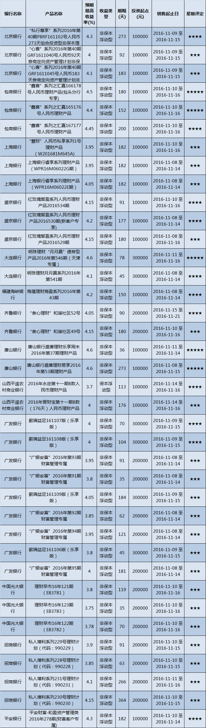 低门槛(10万元以下)理财产品中,华北地区有207款获得普益标准评级,平均预期收益率为3.88%。其中三星产品101款,平均预期收益率为3.72%;四星产品60款,平均预期收益率为3.94%;五星产品46款,平均预期收益率为4.17%。