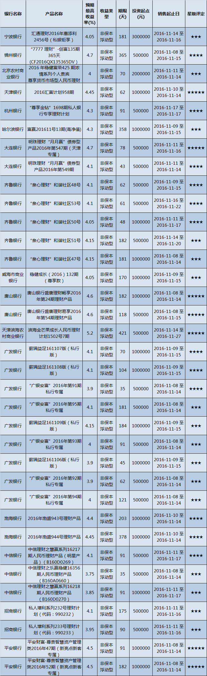 高门槛(50万元及以上)的理财产品中,华北地区有35款获得普益标准评级,平均预期收益率为4.21%。其中三星产品16款,平均预期收益率为4.03%;四星产品12款,平均预期收益率为4.20%;五星产品7款,平均预期收益率为4.65%。