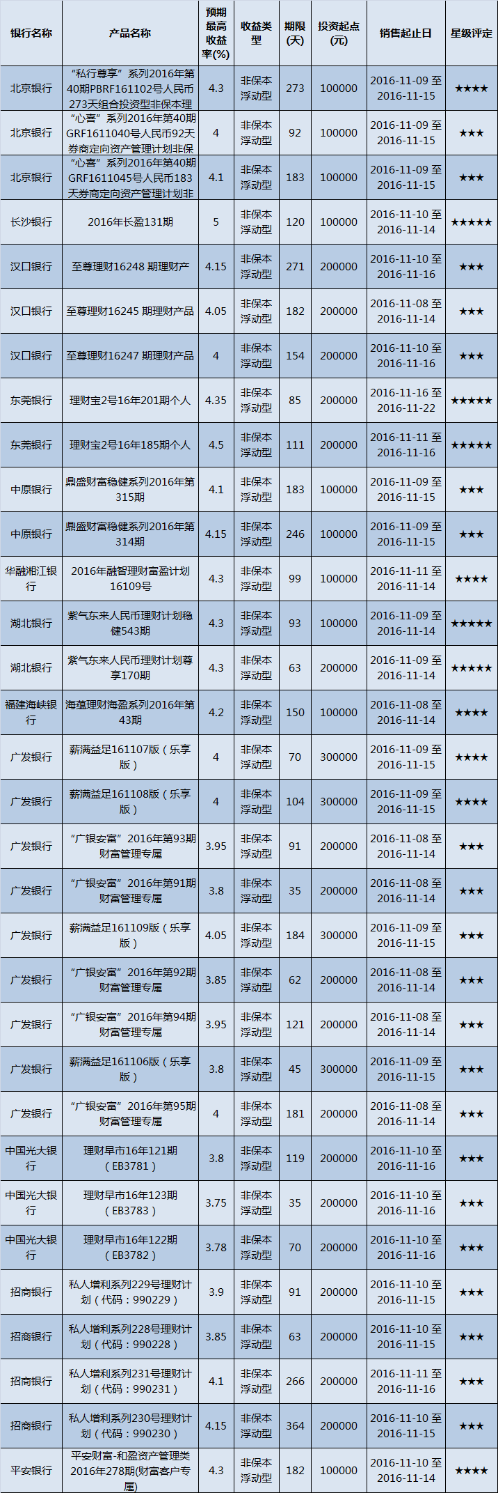 低门槛(10万元以下)理财产品中,华中地区有128款获得普益标准评级,平均预期收益率为3.97%。其中三星产品57款,平均预期收益率为3.84%;四星产品31款,平均预期收益率为3.97%;五星产品40款,平均预期收益率为4.15%。